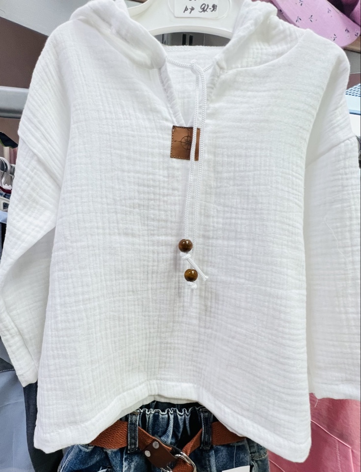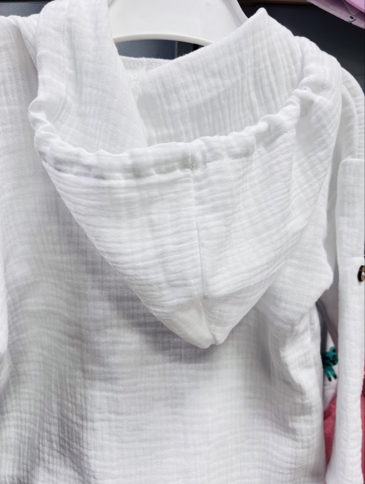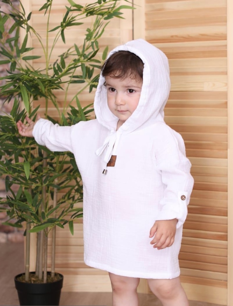 Эта очаровательная туника из лёгкой муслиновой ткани создана специально для маленьких исследователей пляжа. Свободный крой и длинные рукава обеспечат защиту от солнечных лучей, а стильный капюшон дополнит образ и подарит дополнительное удобство малышу.