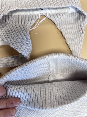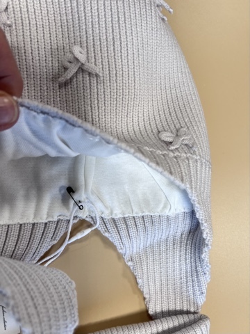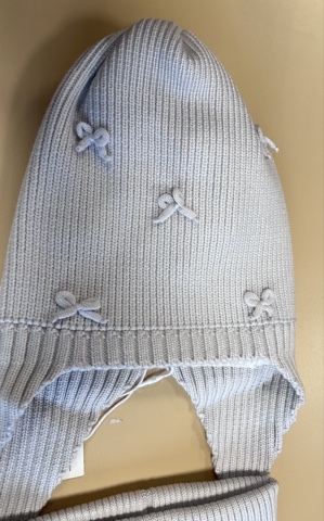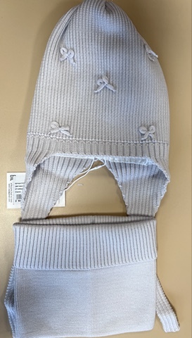 Комплект выполнен из премиальной пряжи. Хорошо садится на голову, удобные длинные завязки. Цвет - серый беж.