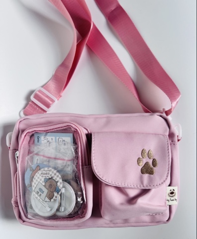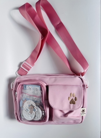 Имеет 2 внешних кармана и одно большое отделение.Также есть 5 значком для внешнего украшения.